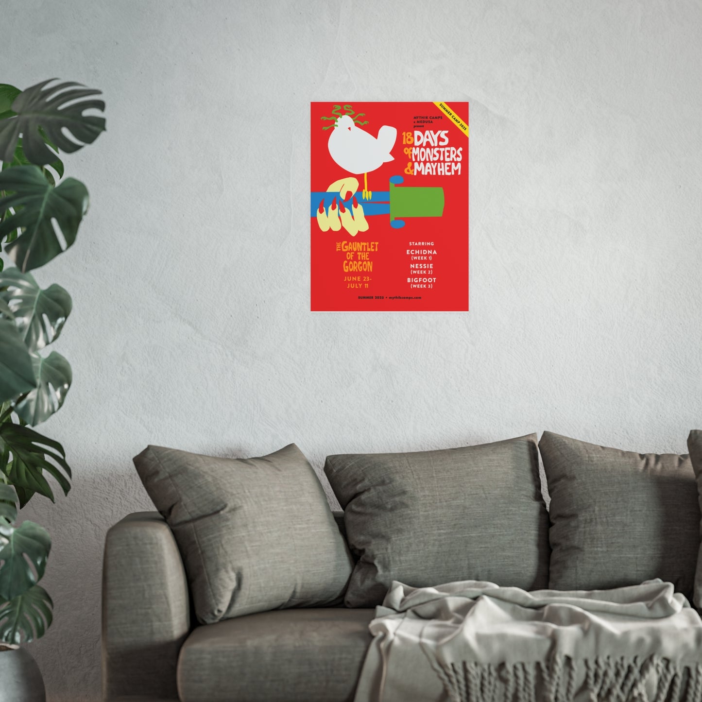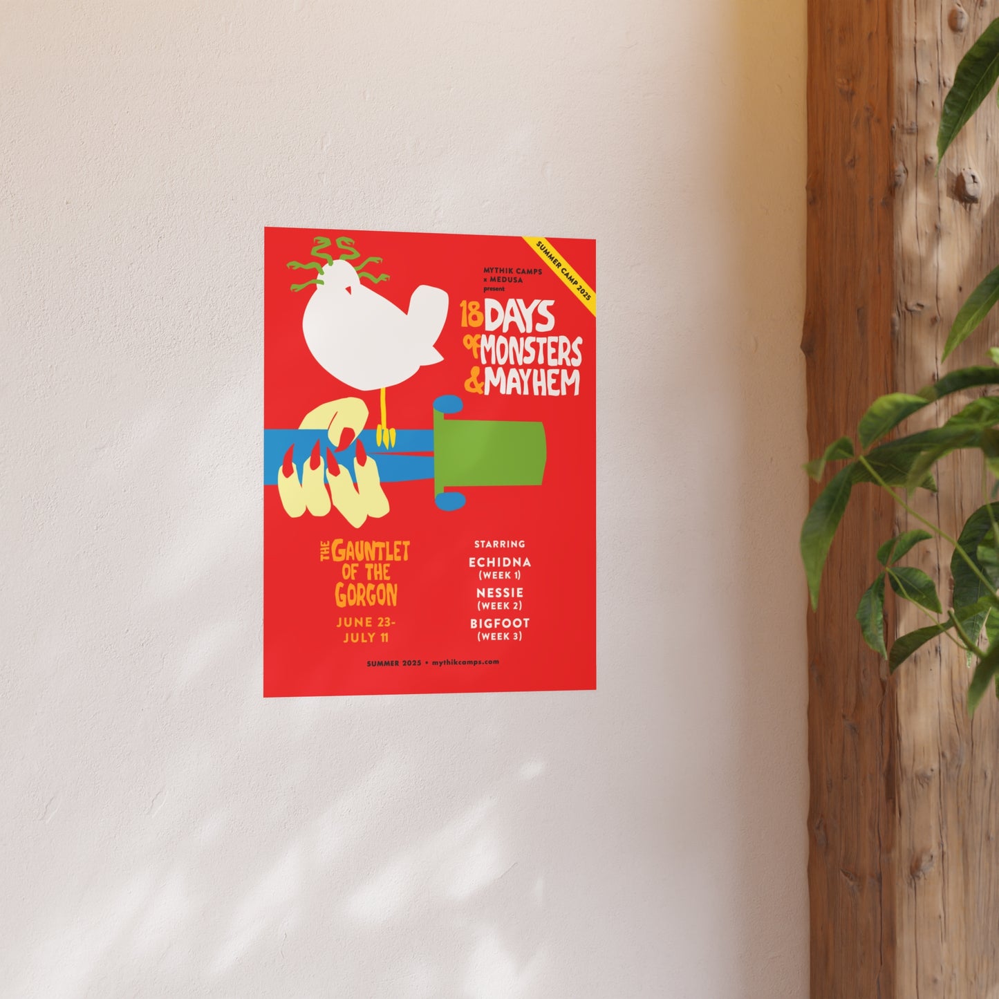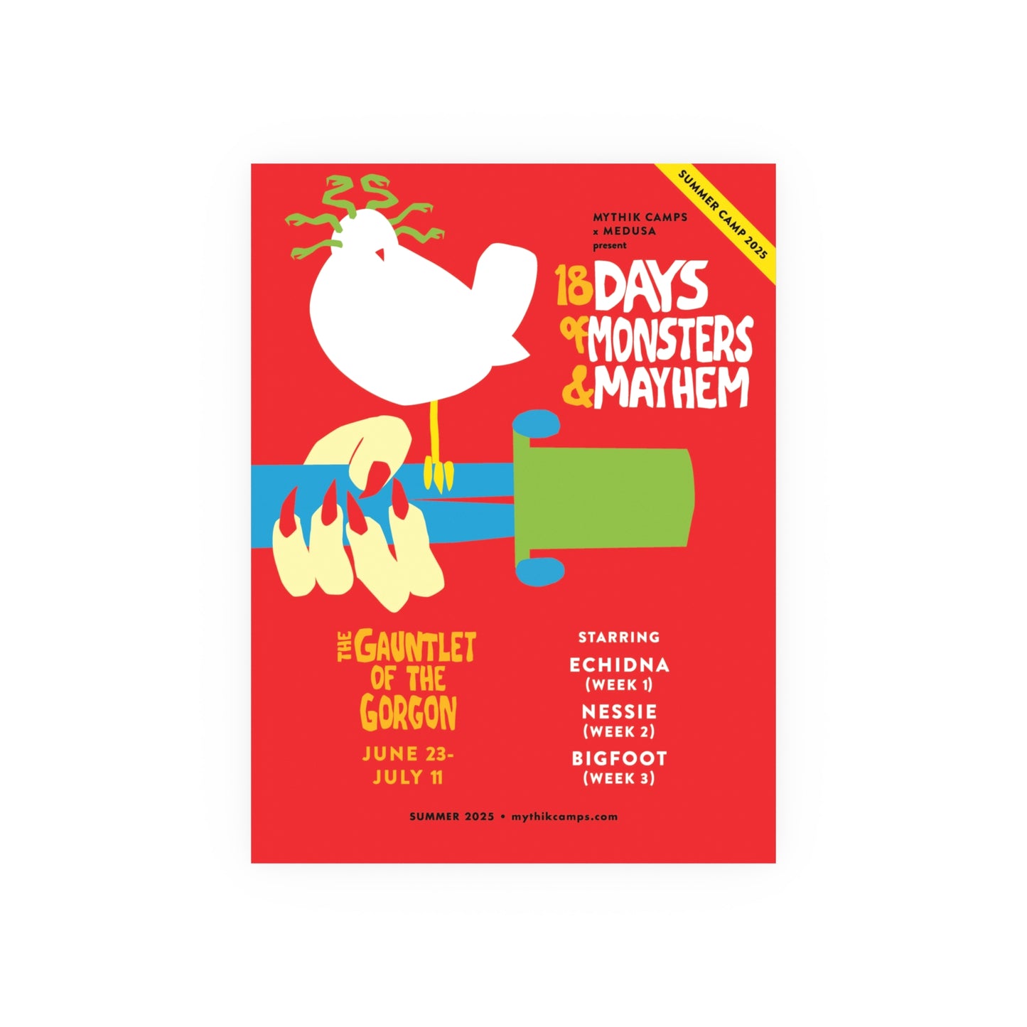 Get your 2025 The Gauntlet of the Gorgon Camp Mythik Poster in a larger size! Showcasing the epic monsters campers will face each week on their summer adventure. Grab yours before they’re gone!